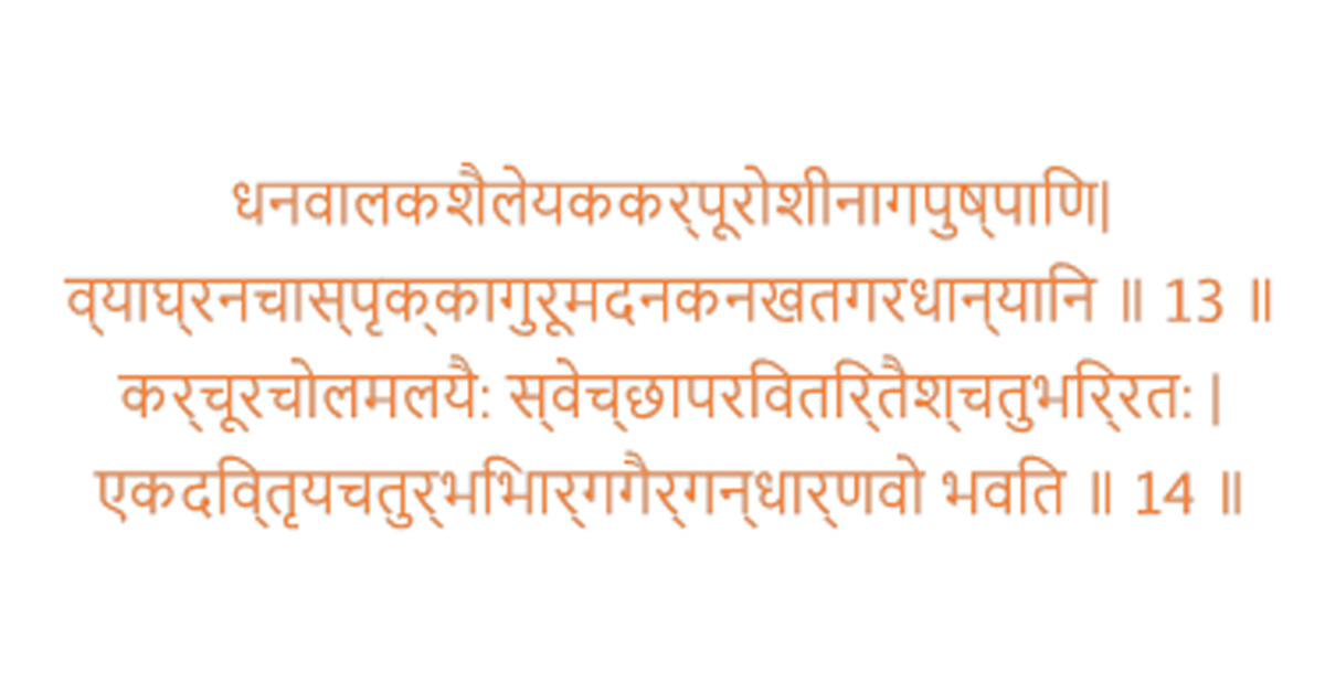 Ušira (Vetiveria zizanoids - a root), Aguru (Aegle marmelos - a resinous wood), Vālaka (Aporuosa lindleyana - a medicinal herb), Madanfal (Randia spinosa poir - bark of a tree), Karpûra (Camphora officinarum - camphor), Dhānya (Coriandrum sativum - coriander or cilantro), Nāgapuspa (Mesua ferrea - Indian Rose Chestnut tree), Tagara (Valeriana jatamansi jones - root of Sugandhbala or Indian Valerian tree), Saibya (benzoin - a resin that has a sweet vanilla like aroma and works as a fixative), Sprkkā (Bryonopsis laciniosa - shivlingi herb), Ghana (Cyperus rotundus - dried root powder of nagarmotha or Nut grass), Karcûra (Hedychium spicatum herb), Vyāghranakha (Cuttle fish bone tree), Nakha (shell perfume), Coraka (Scirpus articulatus - an aquatic grass) and Chandana (sandalwood). Choosing any 4 of these ingredients will in various permutations and combinations yield 1,820 different compositions of perfumes! So extensive was the resultant number of perfumed mixtures, that this process of obtaining perfumes has been named as Gandhārnava or the ocean of perfumes.